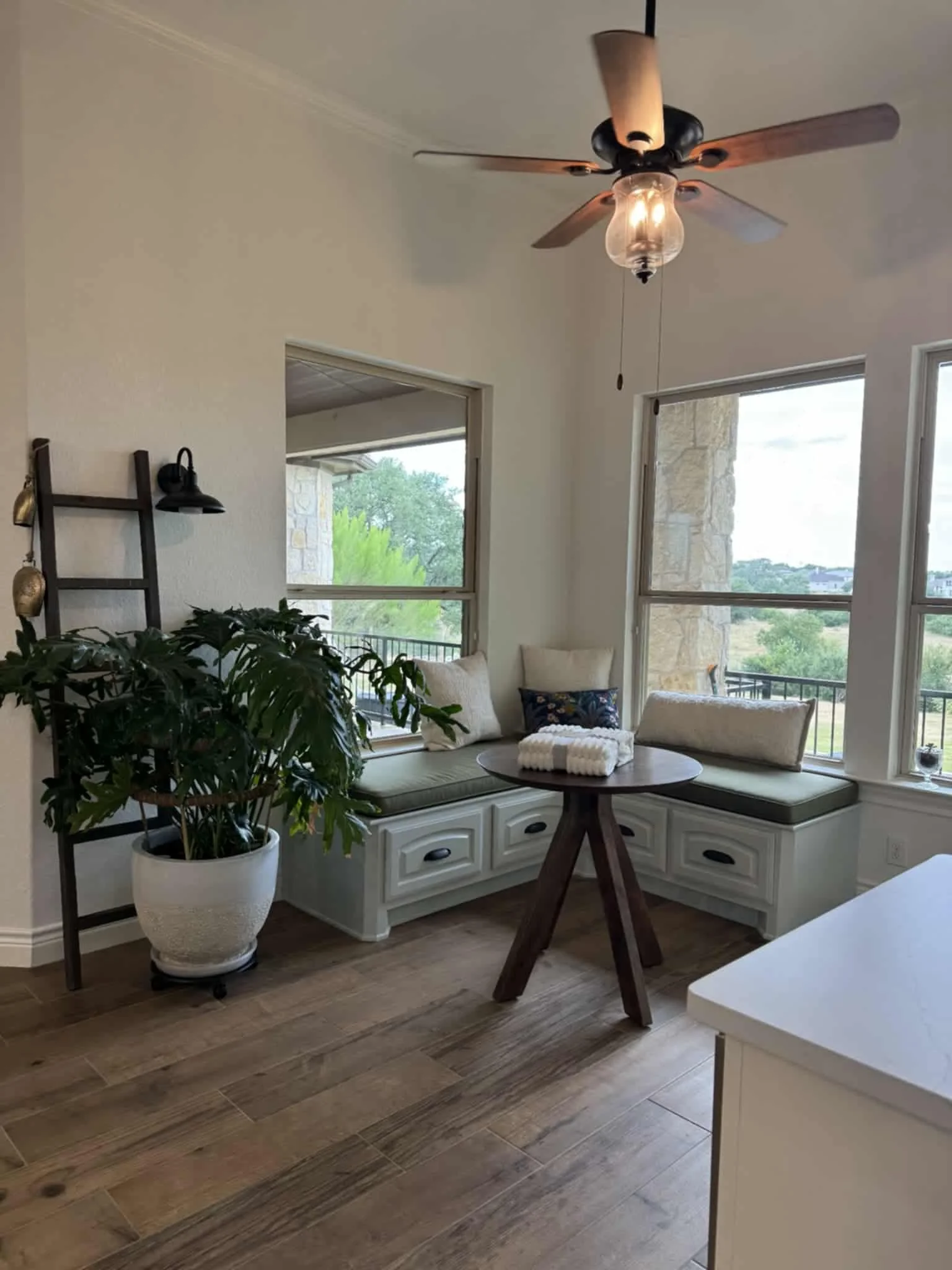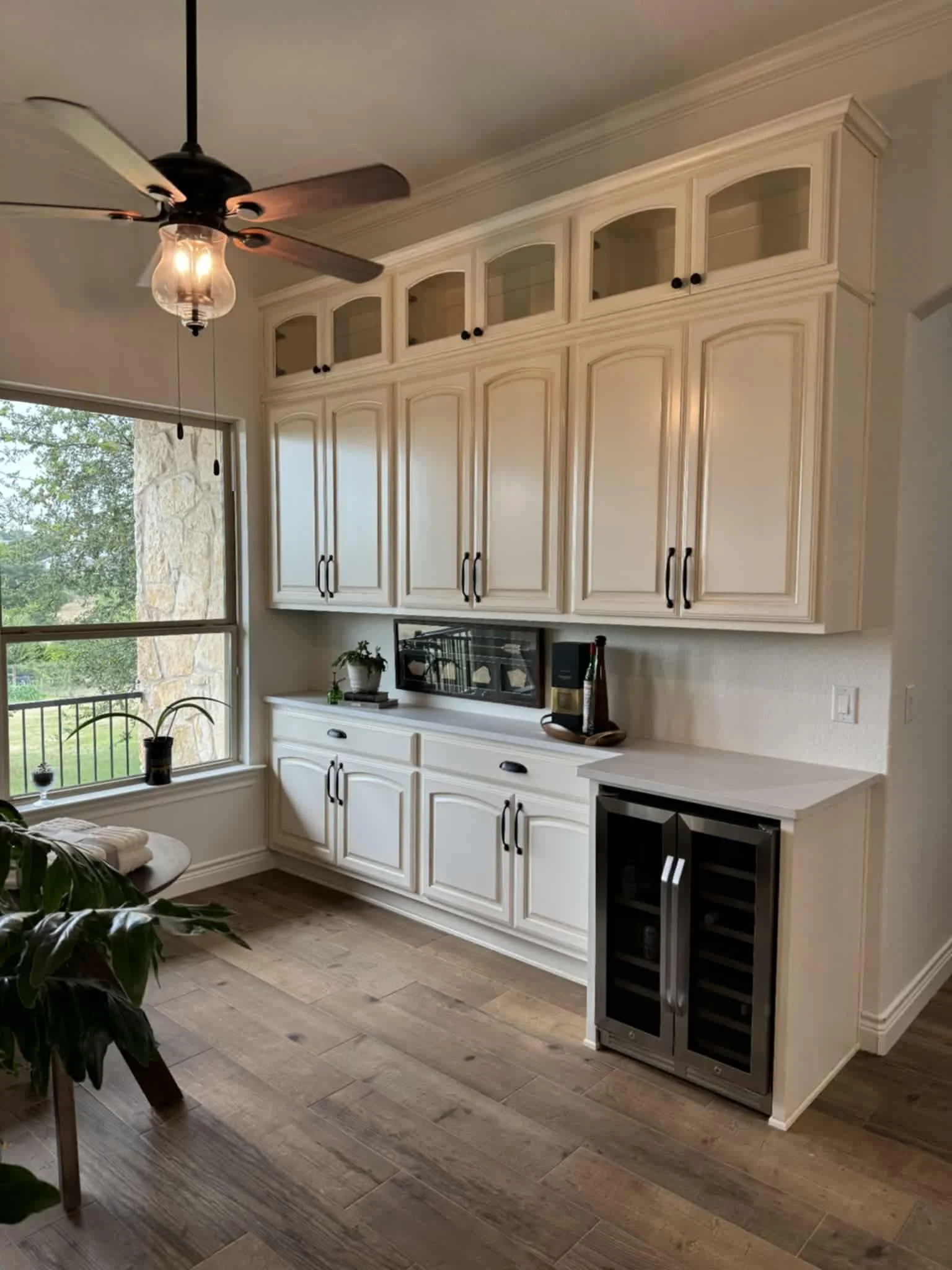 The client chose to refinish her cabinets in this beautiful off white color called "Snowbound" by Benjamin Moore. They are thrilled with how their kitchen feels so open and inviting.